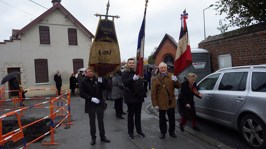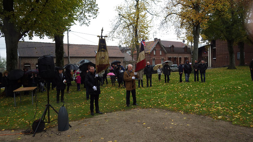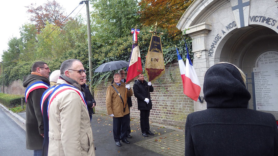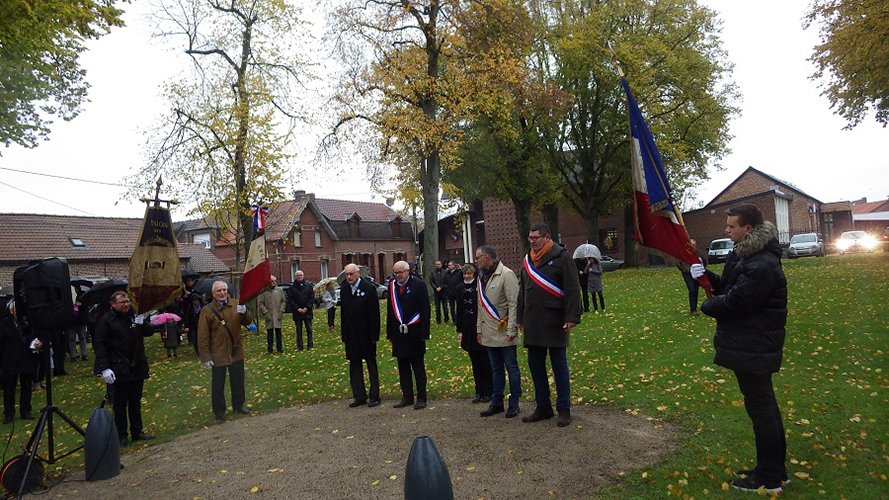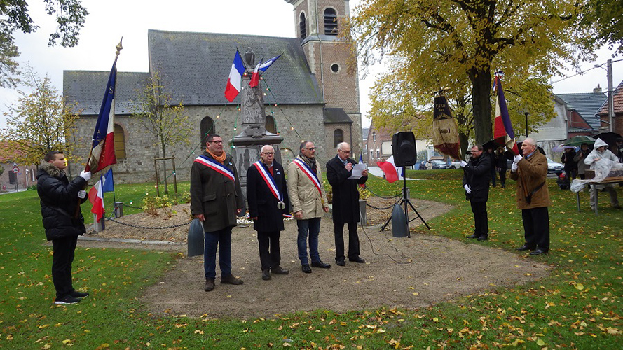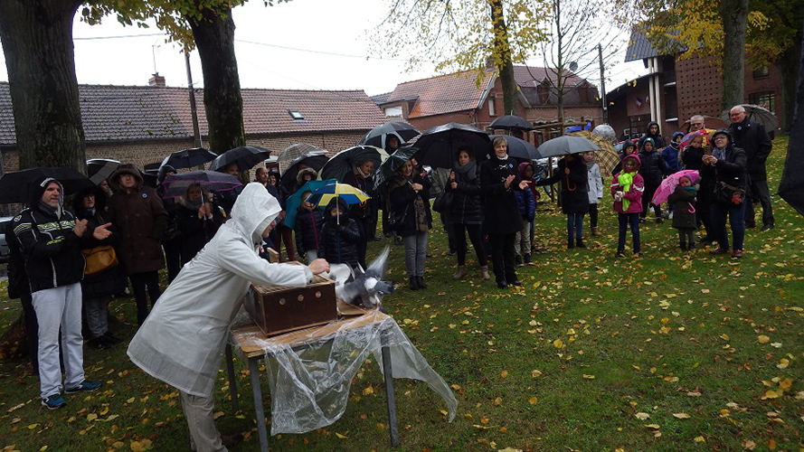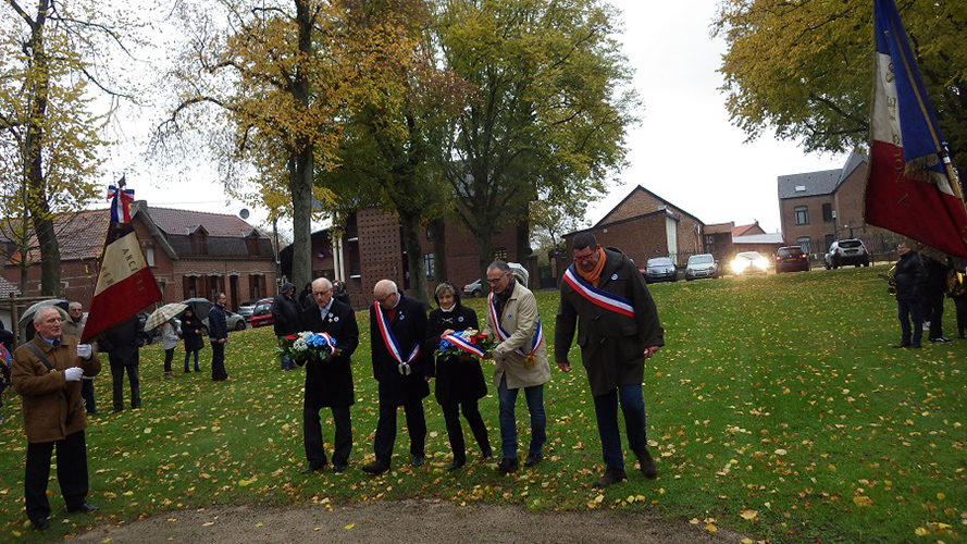 Cette commémoration pluvieuse du 11 novembre a débuté par un premier hommage rendu au cimetière sur les tombes des soldats anglais tombés pour la France, l’hymne anglais et la marseillaise ont été joués, puis nous nous sommes rendus à la stèle rue de Maing. Nous avons ensuite pris la direction de la chapelle des Fusillés rue Jean Monnet pour revenir enfin sur la place du village au Monument aux Morts. A chaque arrêt une gerbe de fleurs a été déposée en mémoire des soldats et des civils tombés pour la France afin de ne pas les oublier. Les discours de Monsieur Didier JOVENIAUX, Maire et de Monsieur Jacques LABBE, Président des anciens combattants ont su rendre un hommage solennel à cet événement. Un lâché de pigeons effectué par Monsieur KUTZA a clos ce défilé.