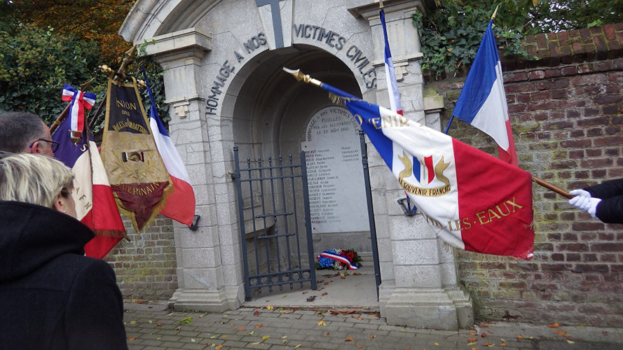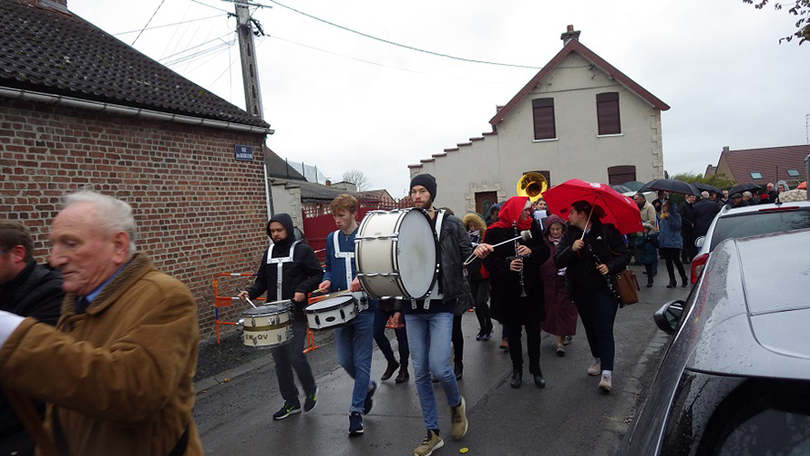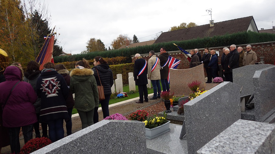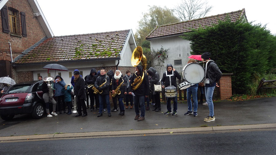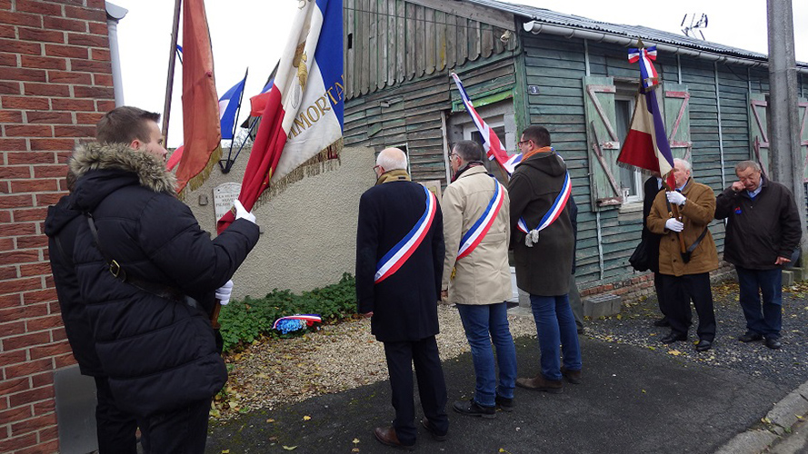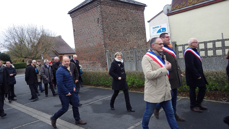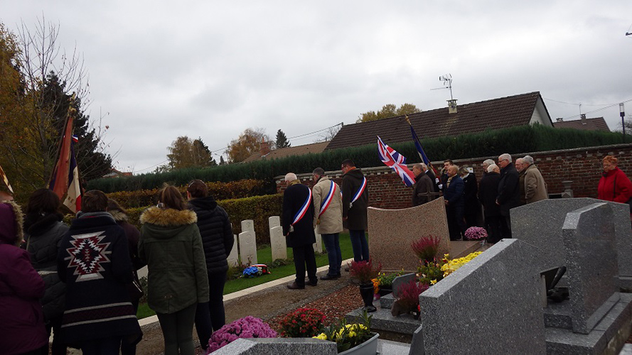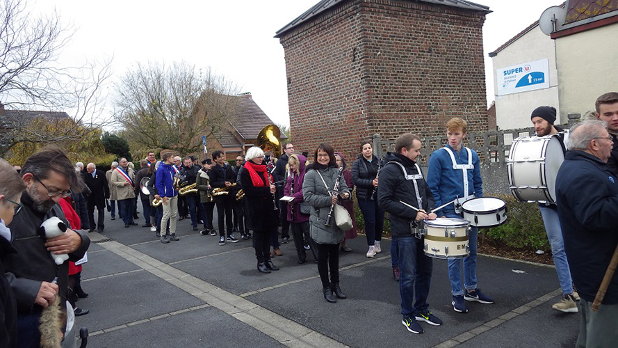 Cette commémoration pluvieuse du 11 novembre a débuté par un premier hommage rendu au cimetière sur les tombes des soldats anglais tombés pour la France, l’hymne anglais et la marseillaise ont été joués, puis nous nous sommes rendus à la stèle rue de Maing. Nous avons ensuite pris la direction de la chapelle des Fusillés rue Jean Monnet pour revenir enfin sur la place du village au Monument aux Morts. A chaque arrêt une gerbe de fleurs a été déposée en mémoire des soldats et des civils tombés pour la France afin de ne pas les oublier. Les discours de Monsieur Didier JOVENIAUX, Maire et de Monsieur Jacques LABBE, Président des anciens combattants ont su rendre un hommage solennel à cet événement. Un lâché de pigeons effectué par Monsieur KUTZA a clos ce défilé.