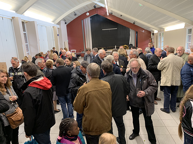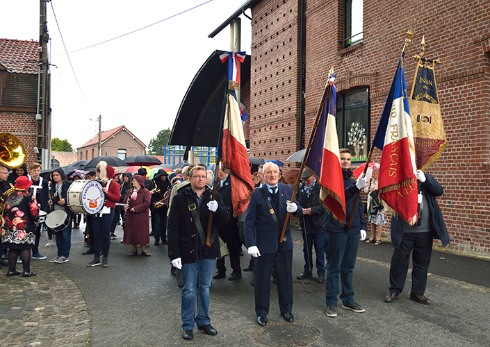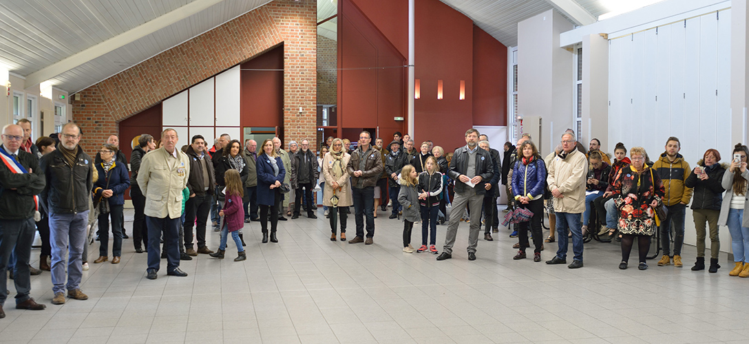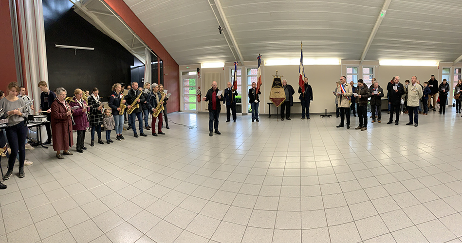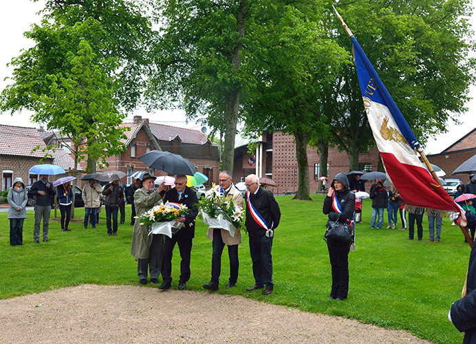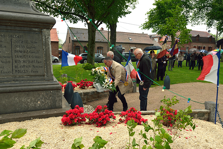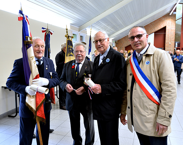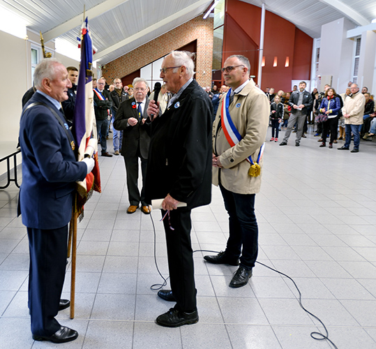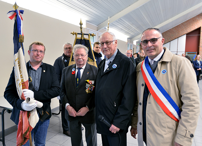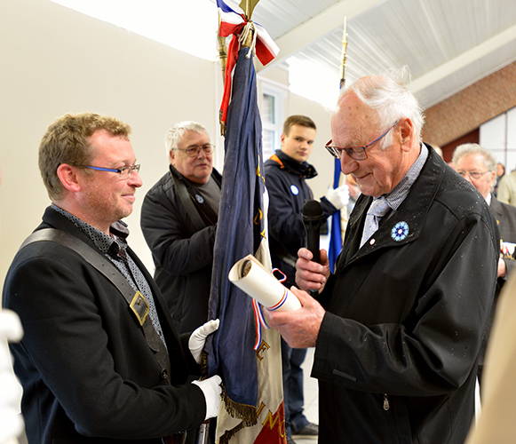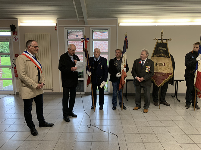 Après le défilé écourté suite à la météo, les discours et le dépôt de gerbes au monument aux Morts de la place Jules Bacq, cette cérémonie s’est continuée à la salle multi spectacles, avec le « Chant des Partisans » (vidéo ci-dessous) chanté par tous, la remise du diplôme « Portes Drapeaux » (10 ans) par le Président des Anciens Combattants M. Jacques LABBE à M. Henri BACQ & M. Cédric PANIEZ, puis, celle-ci s’est terminée par le traditionnel verre de l’amitié.